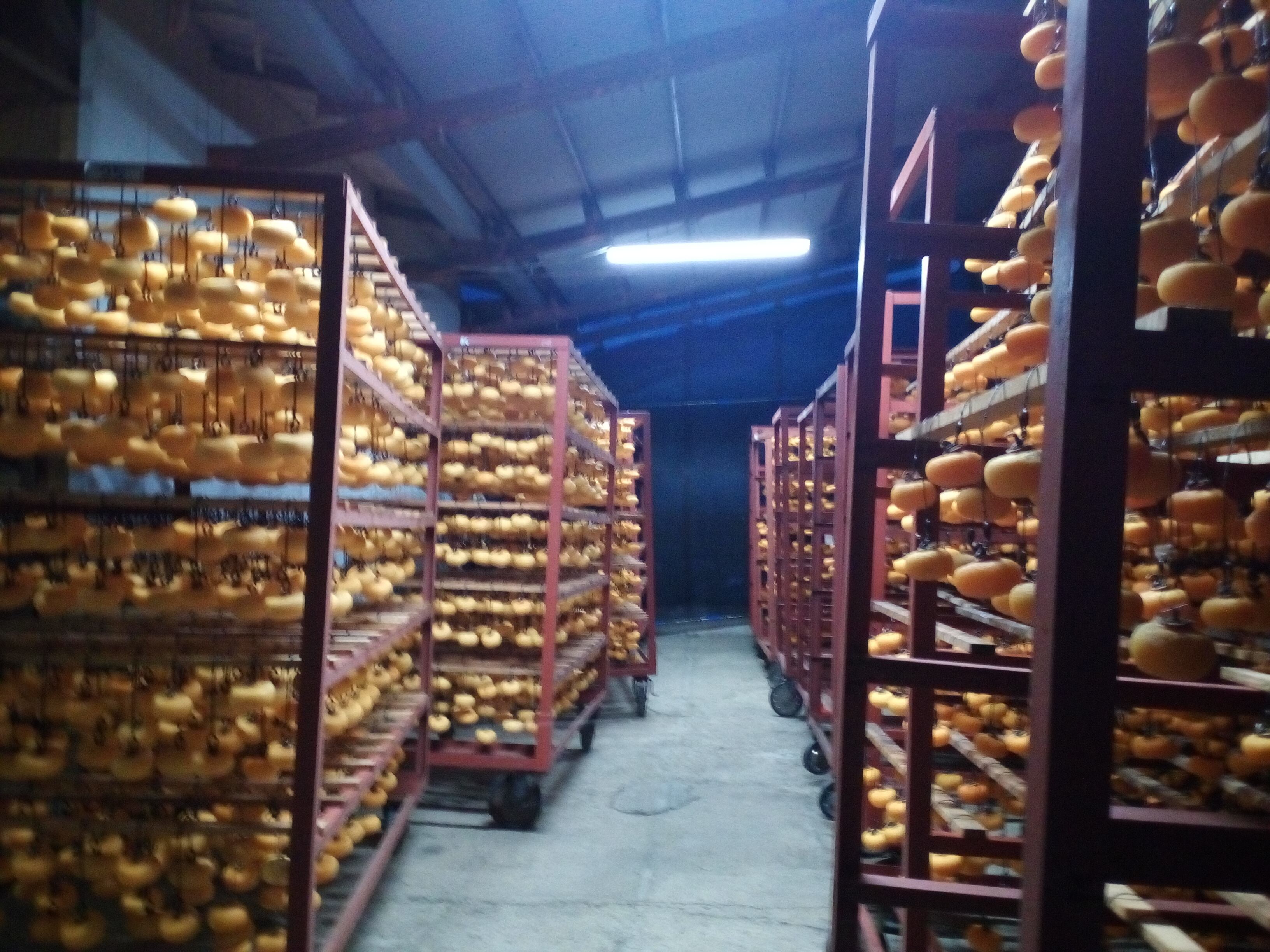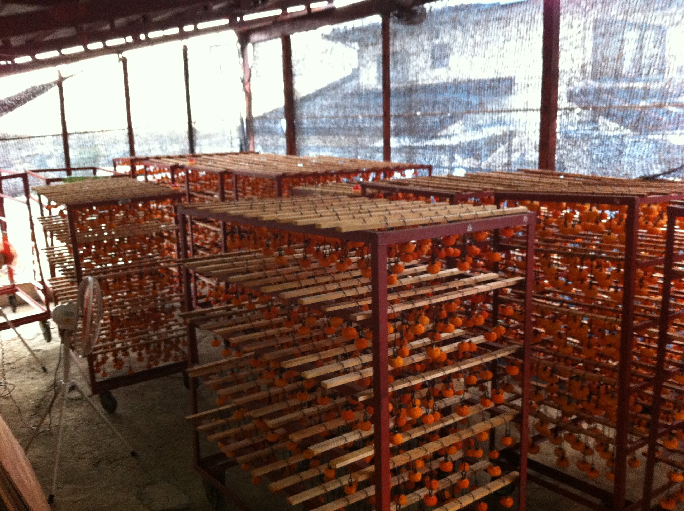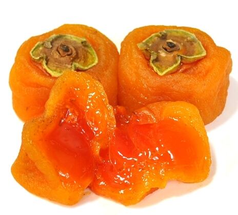 南アルプスの干し柿は大別してあんぽ柿ところ柿に分けられます。あんぽ柿は、乾燥歩合50%程度、中が柔らかい状態で出荷されます。漂白・カビ防止を目的に、硫黄燻蒸(いおうくんじょう)という工程を踏み、後で天日で干すので、硫黄は放散されます。